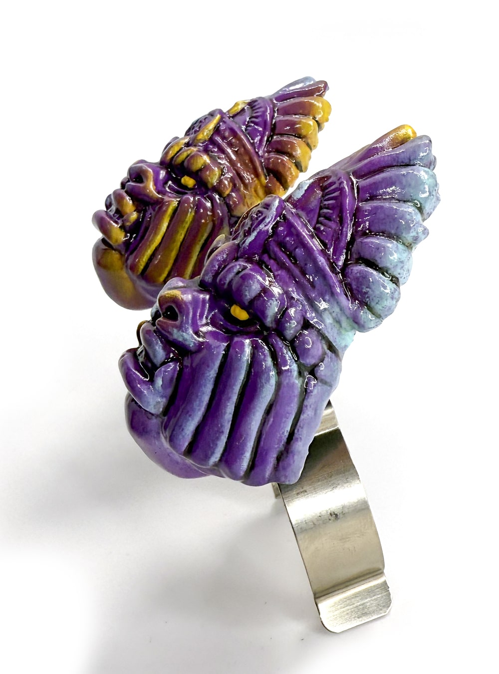 Jeder Kopf wird mit höchster Präzision im 3D-Druck gefertigt und anschließend sorgfältig von Hand bemalt und lackiert. Dieser handwerkliche Prozess garantiert ein detailreiches, ausdrucksstarkes Ergebnis. Die markanten Gesichtszüge, der intensive Blick und die kräftigen Farben in Violett, Blau und Gelb schaffen einen faszinierenden Kontrast. Der aufgetragene Lack sorgt nicht nur für ein glänzendes Finish, sondern schützt die Oberfläche auch vor Abnutzung. So erhalten Sie ein Zubehör, das ästhetisch beeindruckt und gleichzeitig langlebig ist.