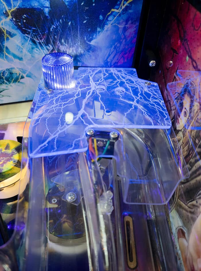 Ein elektrischer und immersiver Effekt: Dieses Blitz-Convolux für den Stranger Things Flipper ersetzt das originale transparente Kunststoffteil. Aus graviertem Plexiglas gefertigt, reagiert es auf UV-Licht und verstärkt die übernatürliche Atmosphäre des Spielfelds.