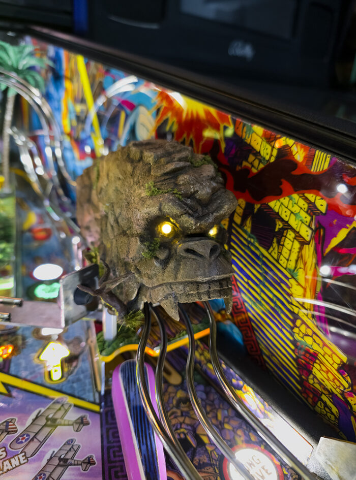 Ein immersives und leuchtendes Dekor: Dieses King-Kong-Höhlenmodul für Flipper ersetzt das originale Plexiglas. Es ist 3D-gedruckt, geglättet und von Hand bemalt und verfügt über integrierte LEDs, die die Augen von King Kong beleuchten, sobald die GI aktiviert wird.