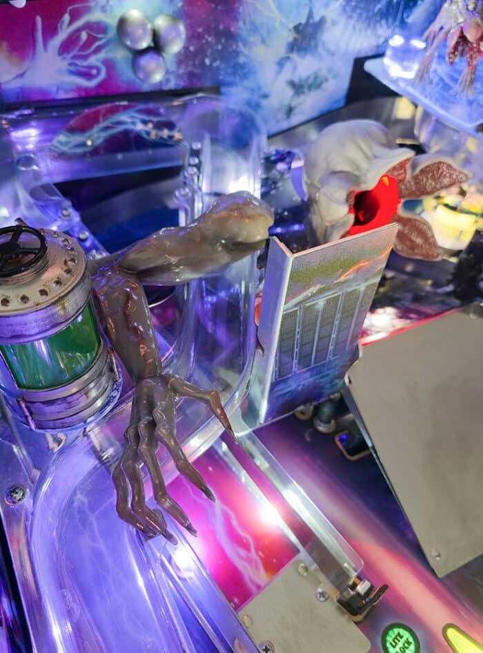 Une menace au centre du plateau : Ce mod Bras du Démogorgon pour flipper Stranger Things apporte relief et tension visuelle. Imprimés en 3D et peints à la main, les bras dévoilent des veines réactives à la lumière UV pour un effet spectaculaire.