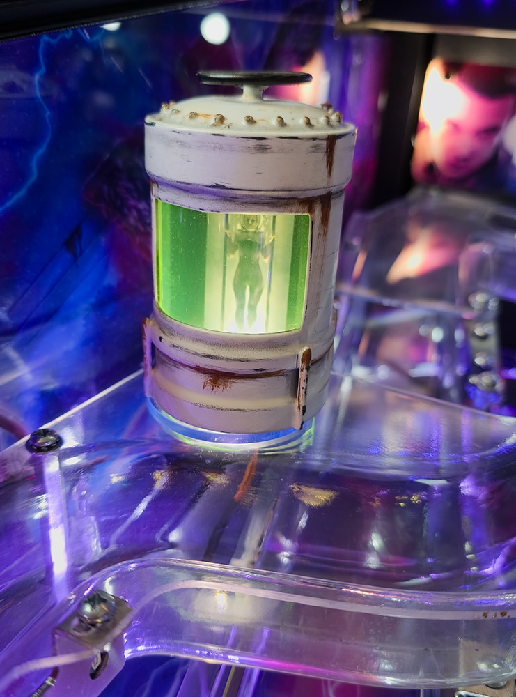 Ce mod se positionne à la place d’un flasher existant. Il suffit de retirer le flasher d’origine et de placer le caisson exactement au même emplacement. Ainsi, aucune modification du plateau n’est nécessaire. Une fois installé, le mod s’illumine grâce à la lumière du flasher, ce qui met en valeur la silhouette d’Eleven plongée dans le liquide vert fluorescent.