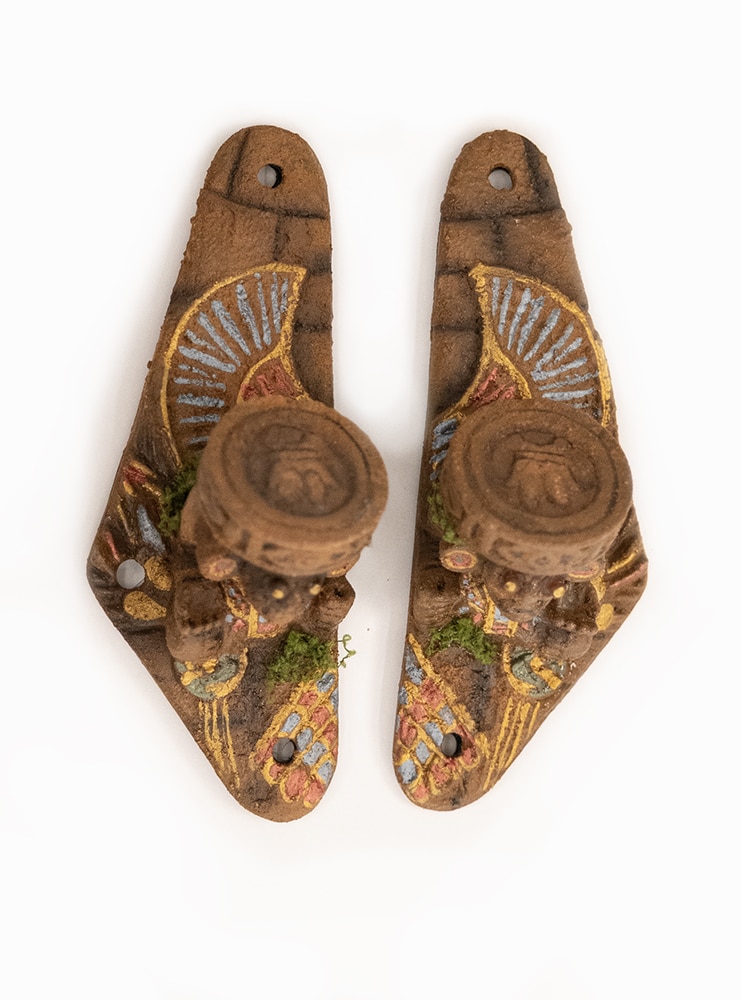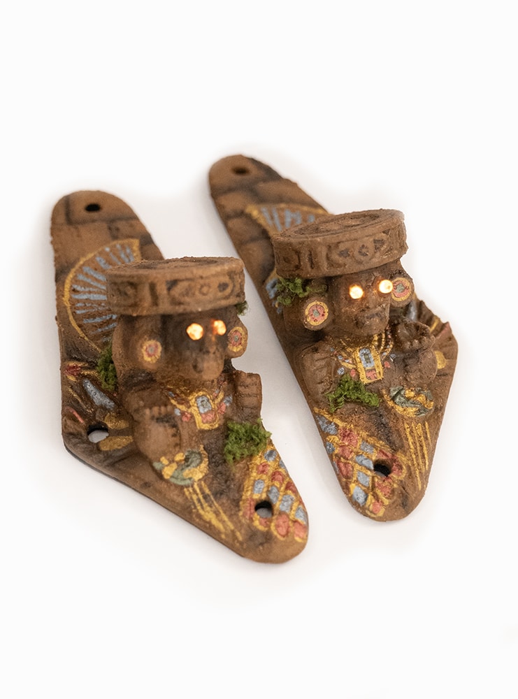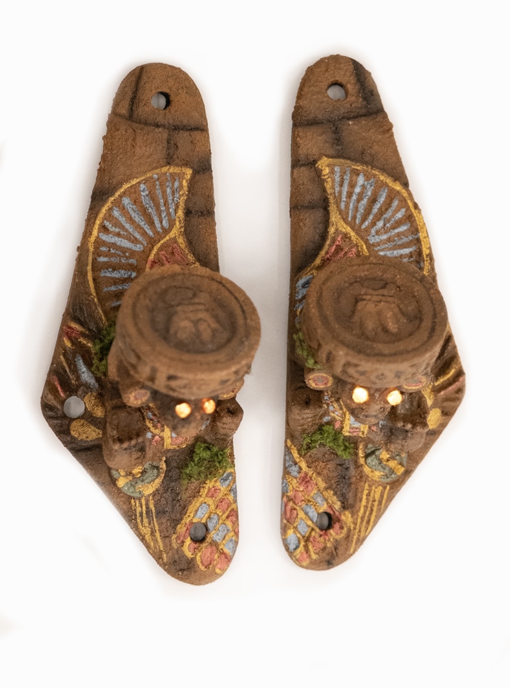 Chaque statue est imprimée en 3D puis peinte à la main. La surface présente des craquelures, des pigments vieillis et de subtils reflets métallisés. Ces détails reproduisent l’apparence de sculptures antiques découvertes dans un temple oublié. De plus, de petites touches de mousse artificielle ajoutent un effet “relique abandonnée” qui renforce encore l’ambiance aventure.